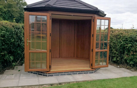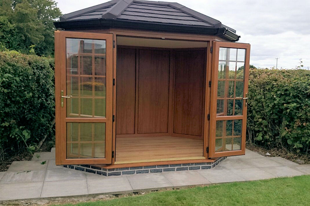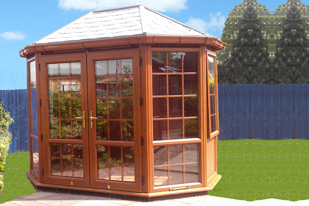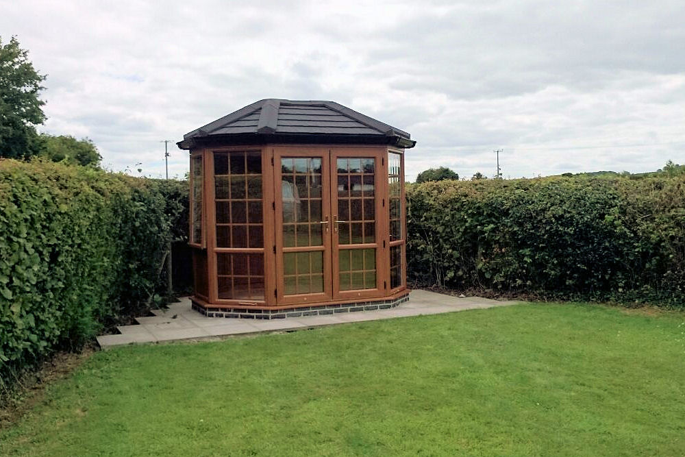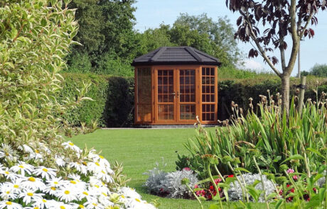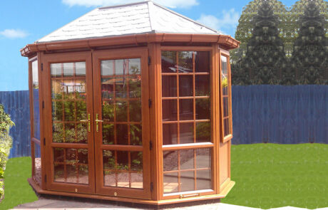 The Clywedog garden room/office is a stretched octagonal design with a simulated slate effect fibreglass roof. The design will complement any garden and is available with the optional extra of georgian glazing bars or with square/diamond leaded bars.