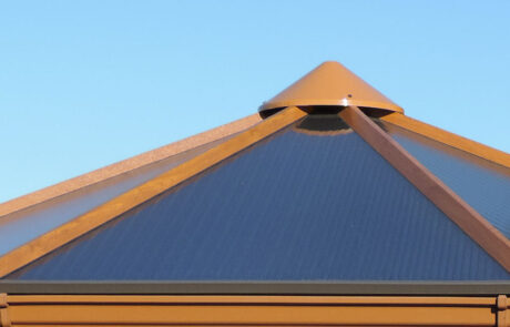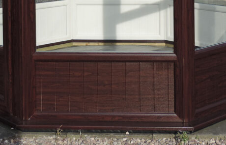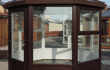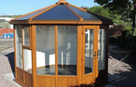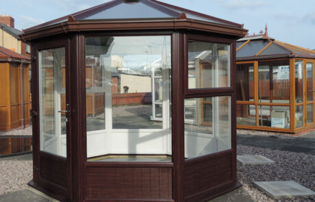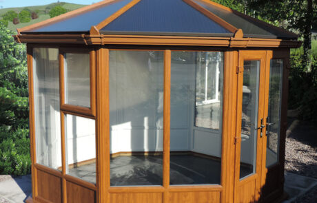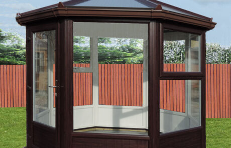 The Conwy pavilion is available in a choice of colours and woodgrain finishes and as standard the roof is glazed with 25mm Polycarbonate, a blue tinted double glazed glass roof or a solid roof is available at extra cost. Constructed in fully reinforced PVCu in the Conwy pavilion is low maintenance and thermally efficient and will not rot or require painting.